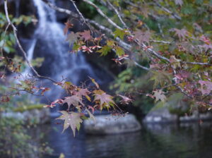 峯の滝前のもみじが色づきました。園内の見頃は今週末までとなりそうです。