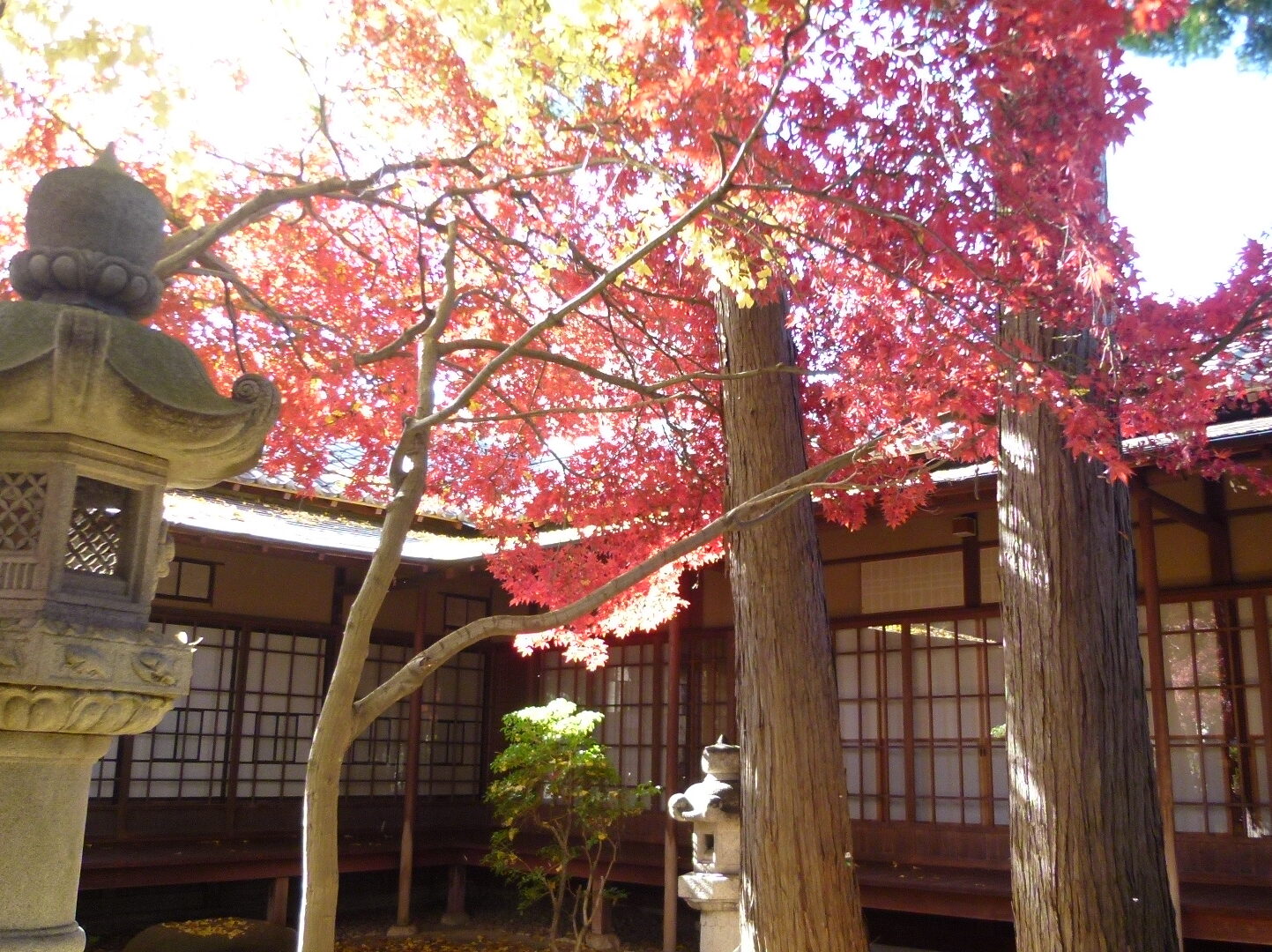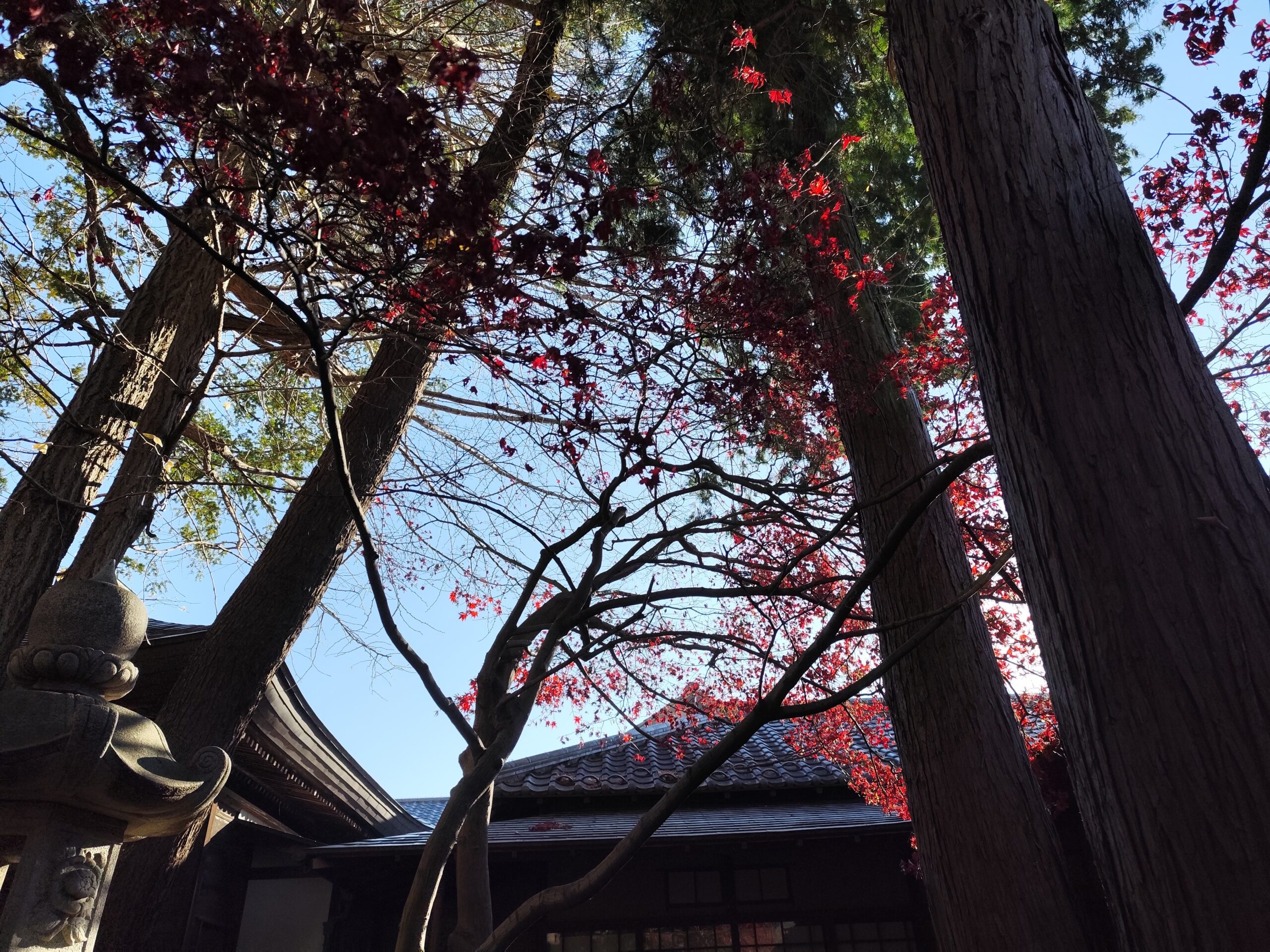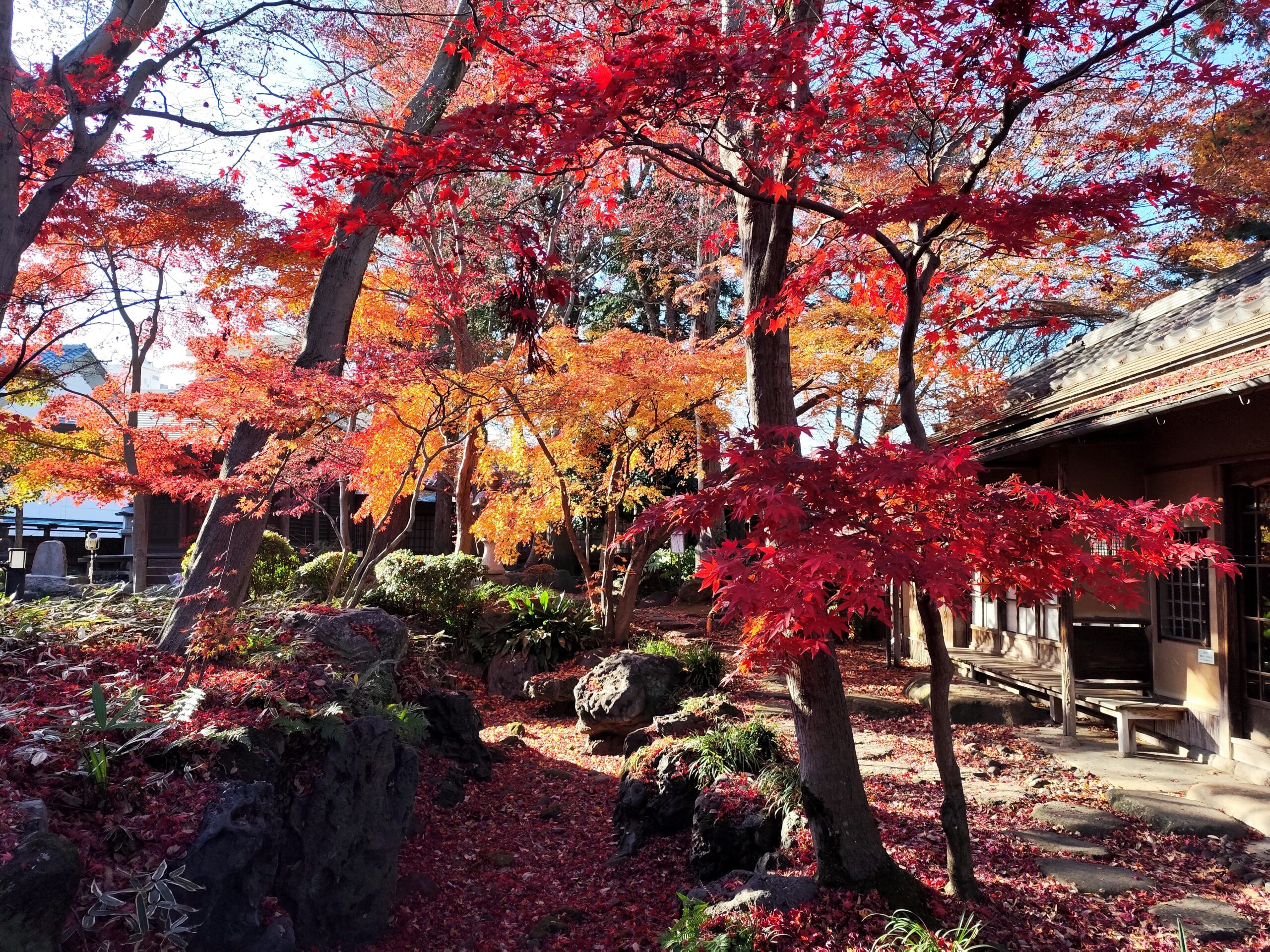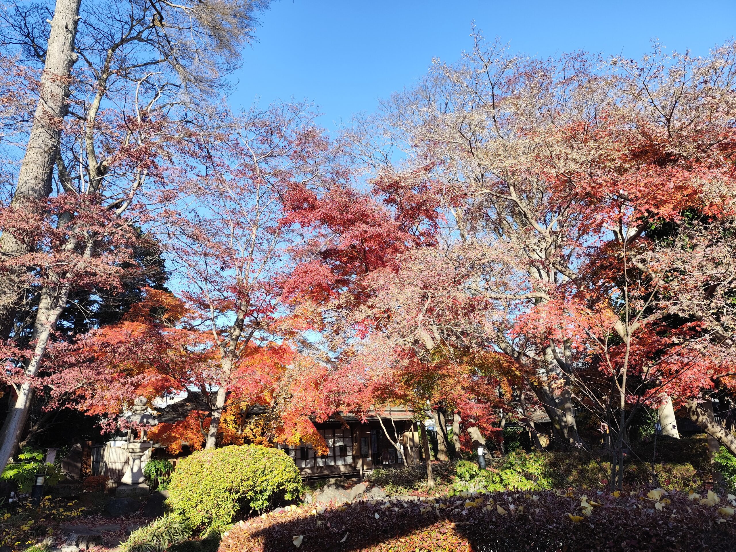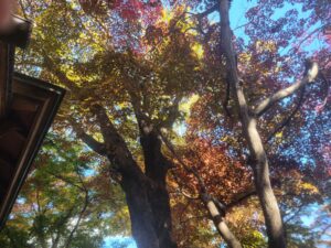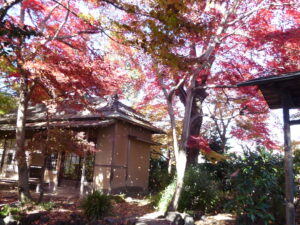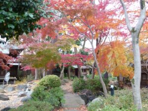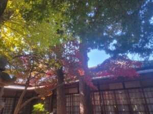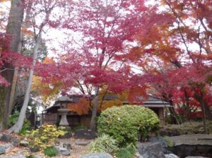 [入口左手]慶雲郷前のもみじも引き続き見頃です。イチョウの葉が落下盛んです。