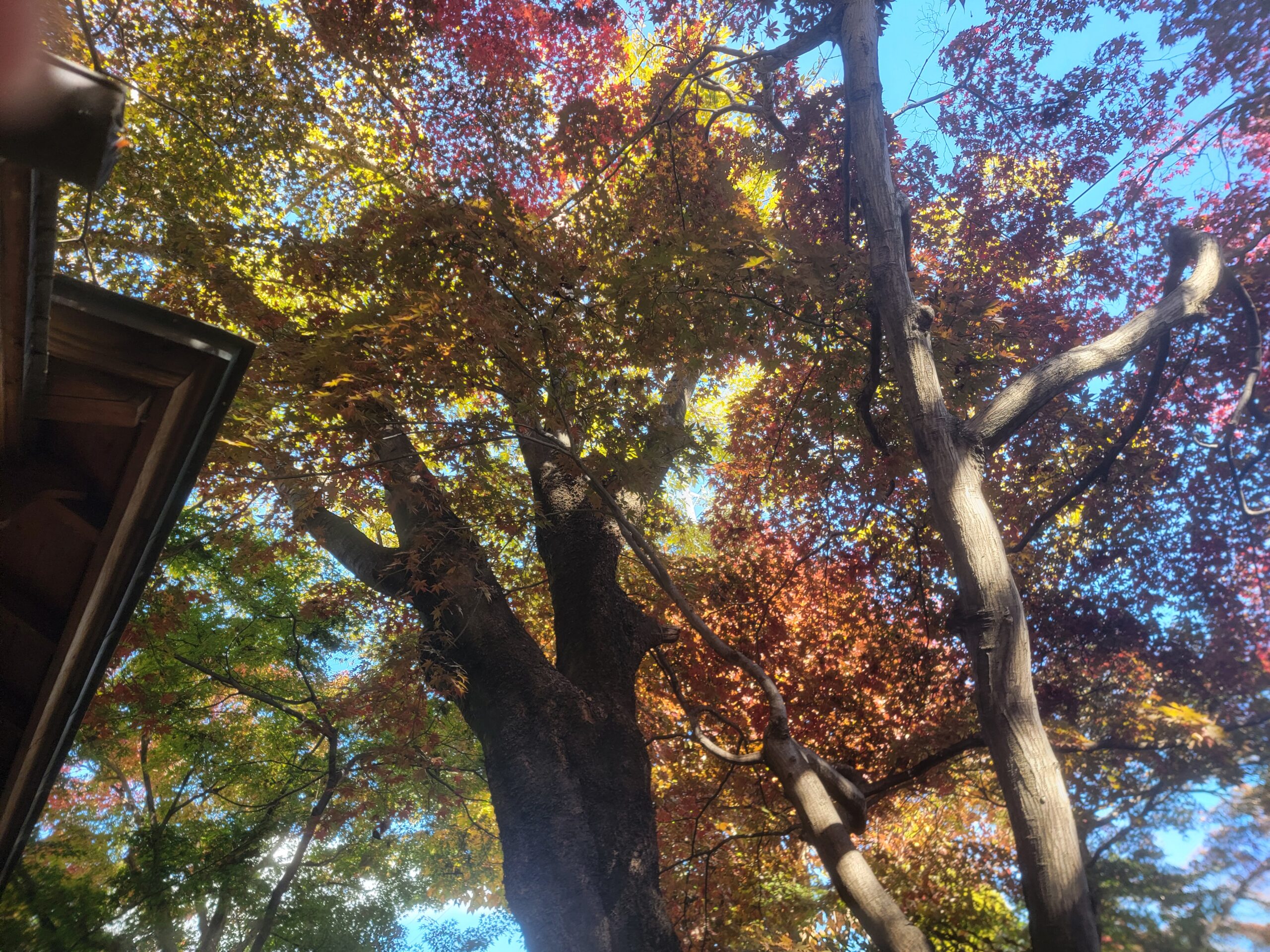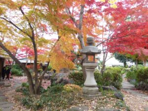 見頃を迎えました。正面右側のもみじは色づき途中ですが、落葉が見られます。
