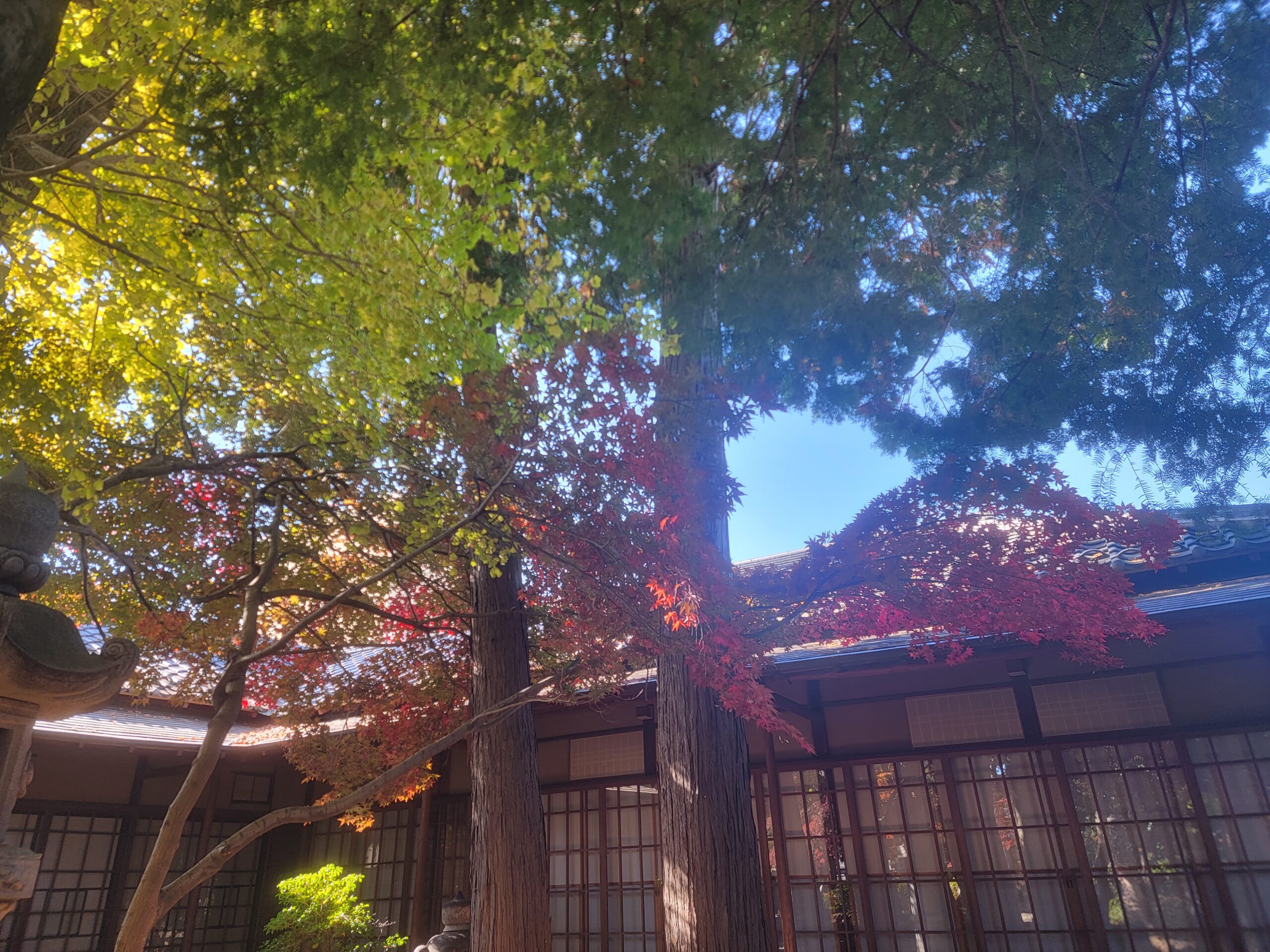 [入口左手]慶雲郷前のもみじ、見頃となっています。イチョウの黄色とコントラストがきれいですね。
