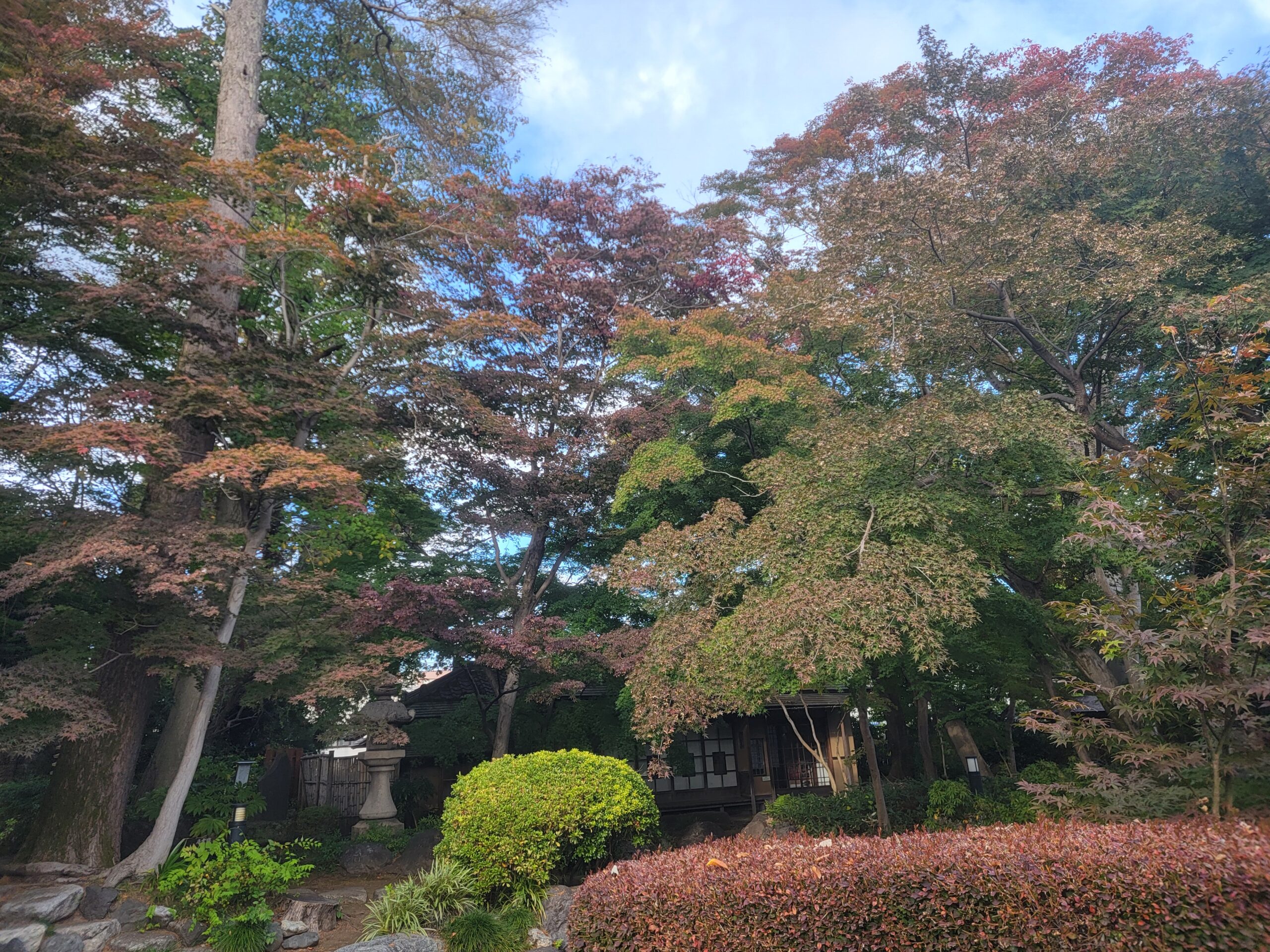 見頃を迎えました。正面右側のもみじは色づき途中ですが、落葉が見られます。