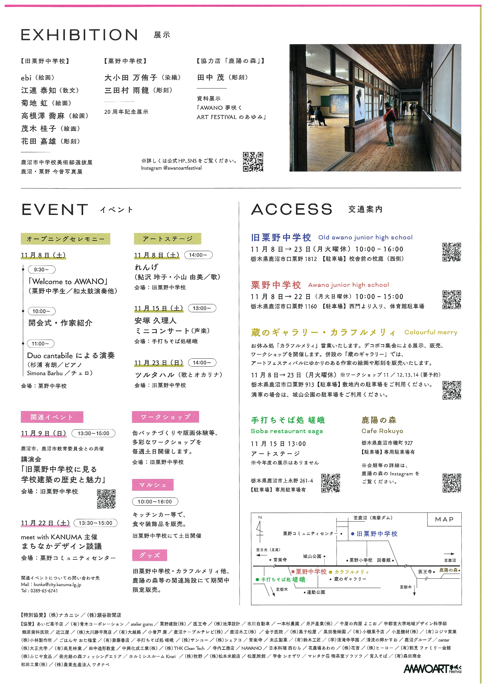 様々な分野で活躍するアーティストの作品が6ヶ所で展示され、会期中はオープニングセレモニーをはじめ、アートステージ、ワークショップ、マルシェなどが行われます。鹿沼(粟野地区)の美しい里山の風景を感じながら、アートにふれてみてはいかがでしょうか。